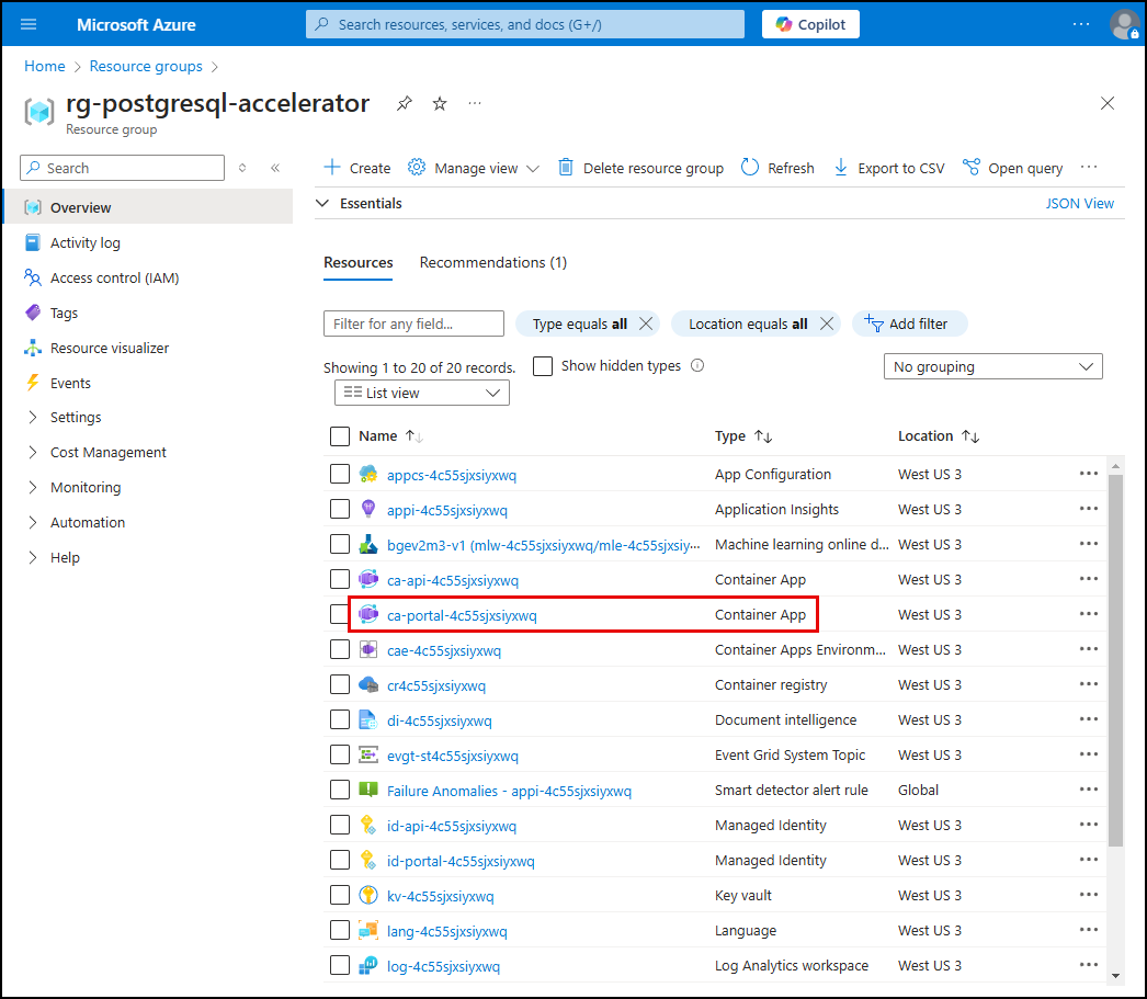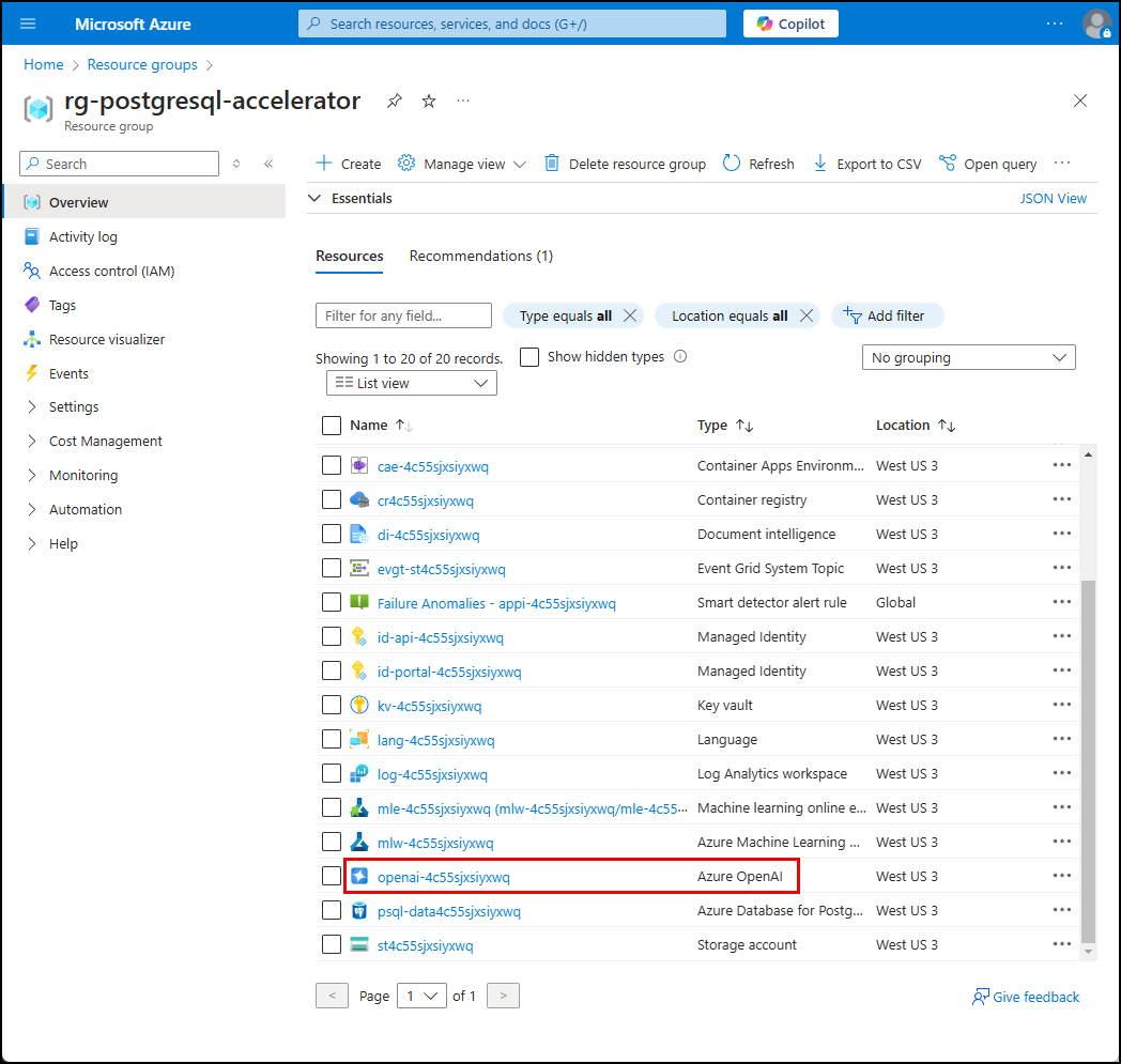 rg-postgresql-accelerator(or, if you assigned a different name, find that one). This resource group was created for you as part of theazd upresource deployment. It contains all of the Azure resources required to build and deploy your AI-enable solution.You can use the search filter to reduce the number resource groups displayed.