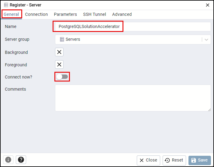 On the General tab, enter "PostgreSQLSolutionAccelerator" into the Name field and clear the Connect now option.